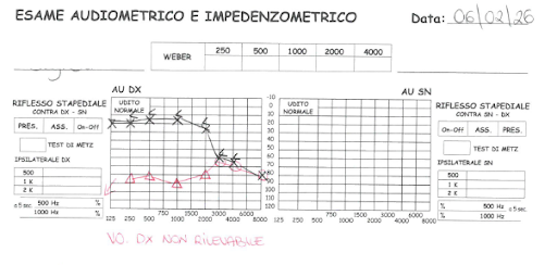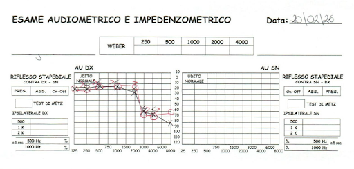 Paziente, maschio di 70 aa, inviato per sviluppo da 10 giorni rispetto prima visita dallo specialista audiologo con un quadro di ipoacusia grave-profonda ed acufene dx in calo bilaterale per le frequenze acute noto.